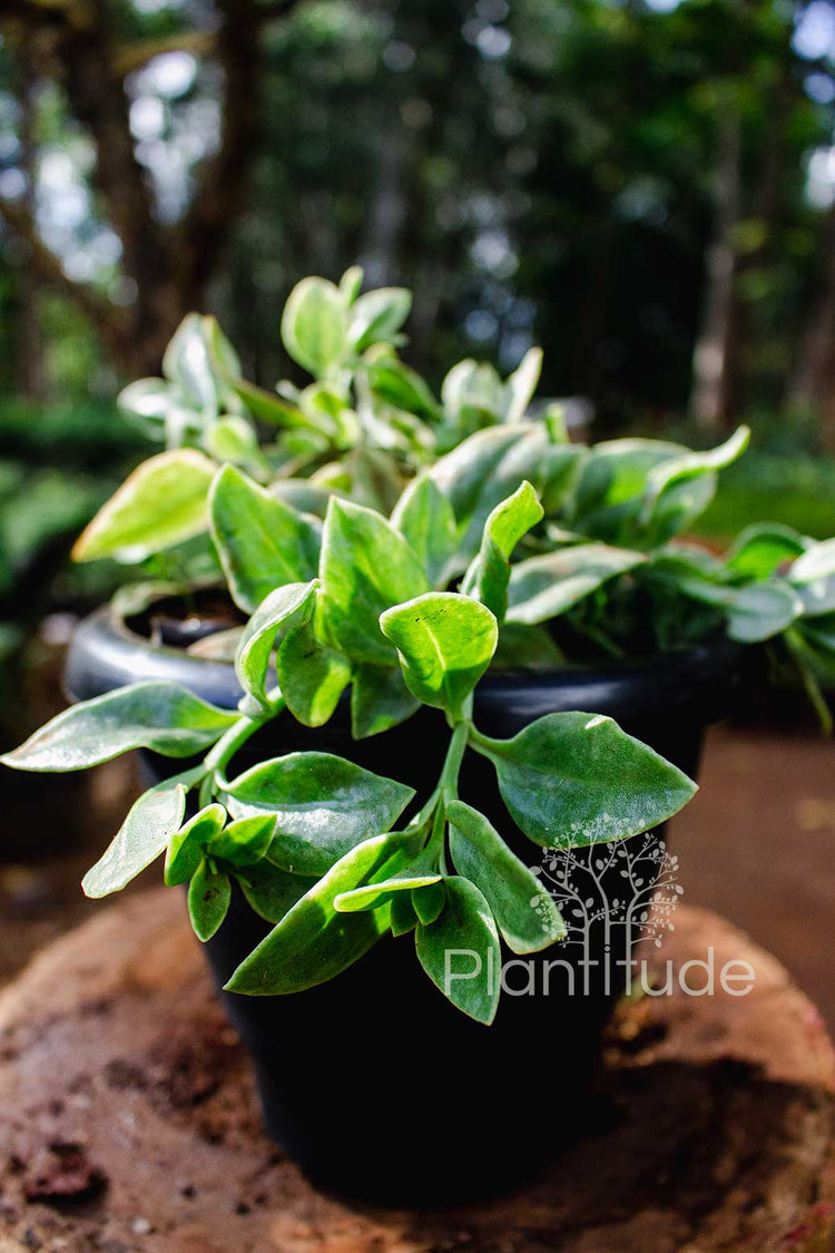 An evergreen and fast-growing succulent. The green leaves are fleshy, flat, heart- to oval-shaped. They form a thick glossy carpet and has small bright pinkish flowers. The succulent stems grow flat on the ground.