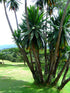 An evergreen palm-like tree with large branches rising from the base. It has long shiny dark green leaves over 1m long with wavy edges. The tree has pale white yellow-green cluster of flowers.