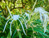 A herbaceous perennial plant with long strap-shaped dark green leaves. The white flowers are shaped like spiders with a central cup and long slender petals hanging off it. The vanilla-scented flowers grow on top of stalks.