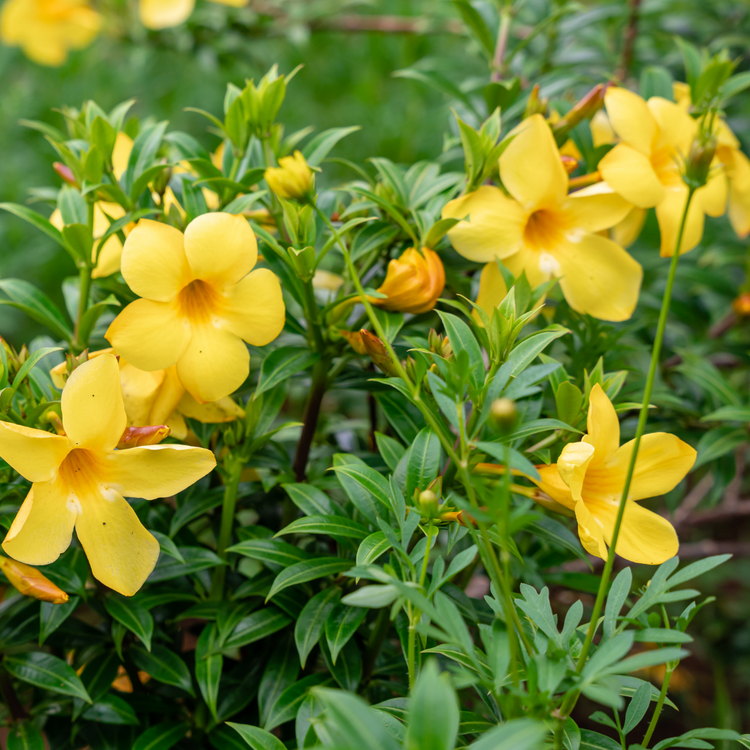 OAllamanda cathartica, Golden Trumpet, is a tropical, evergreen vine or shrub known for its large, trumpet-shaped, bright yellow flowers. The plant has glossy, dark green, oval-shaped leaves that grow in whorls along its long, flexible stems. Its striking yellow flowers bloom profusely during the growing season, making it a popular choice for ornamental use. It thrives in full sun and well-drained soil, often used in landscaping as a climber on trellises or as a bushy shrub with regular pruning.