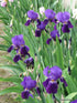 An evergreen herbaceous perennial with grey-green leaves. The leaves are sword-shaped and upright. It grows from creeping rhizomes forming clumps. Flowers have 3 upright petals and 3 dropping petals with yellow beards.