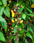 A woody stemmed evergreen vine that has long elliptical green leaves. It bears hanging blossoms in the shape of a slipper that are yellow with maroon bases. It is fast growing, covering up trellises and fences quickly.