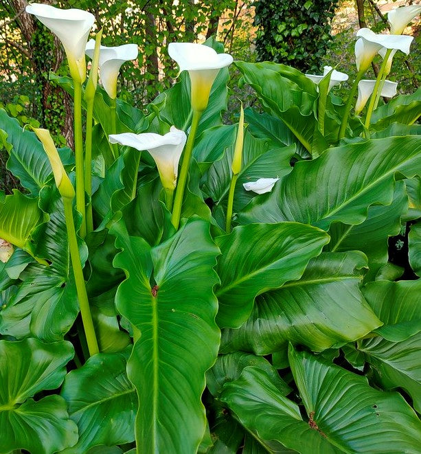 A clump-forming herbaceous perennial with beautiful large, white trumpet shaped flowers with a finger-like yellow spadix. The large leaves are borne on long arrow-shaped glossy dark green leaves.